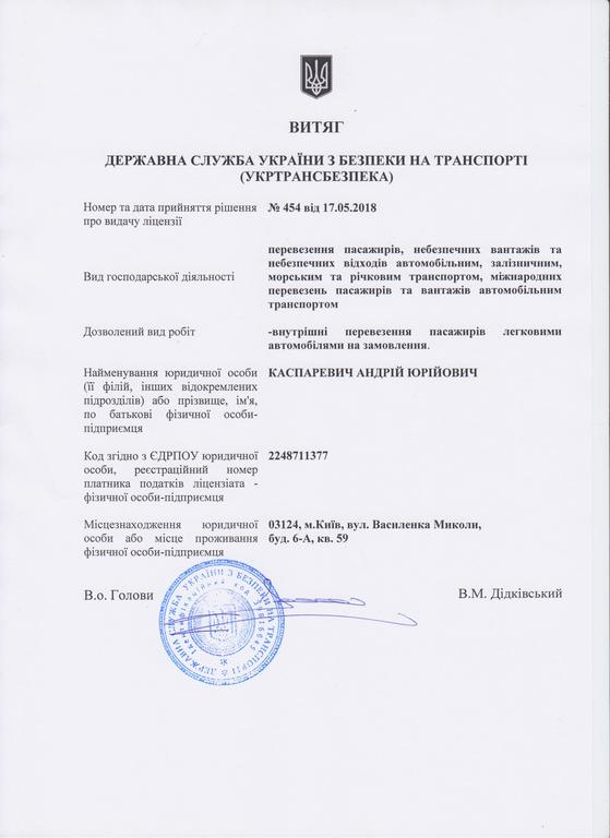 Лицензия на перевозку пассажиров легковыми автомобилями на заказ Каспаревича Андрея Юрьевича